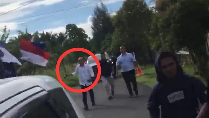 Frans kemudian mengayunkan parang yang dibawanya ke kaca mobil pickup yang digunakan massa aksi. Terlihat massa aksi langsung lari berhamburan menjauhi Bupati.