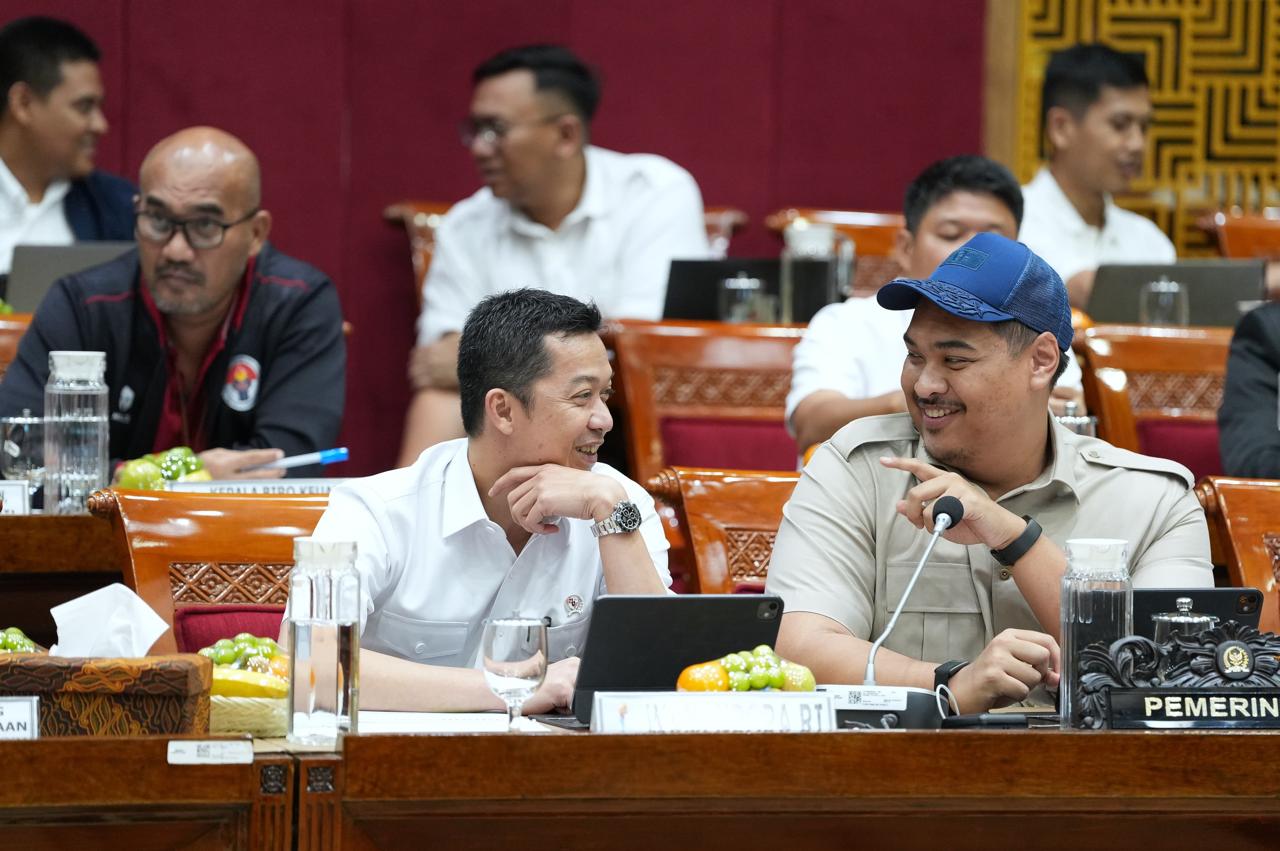 Jakarta: Menteri Pemuda dan Olahraga Republik Indonesia (Menpora RI) Dito Ariotedjo bersama Wamenpora Taufik Hidayat serta para pejabat eselon I dan II mengikuti rapat kerja (raker) dengan Komisi X DPR di Kompleks Parlemen, Senayan, Jakarta, Kamis (10/7).